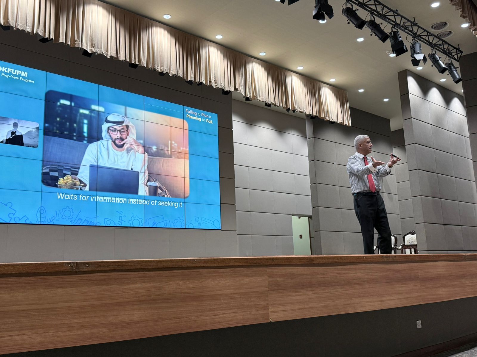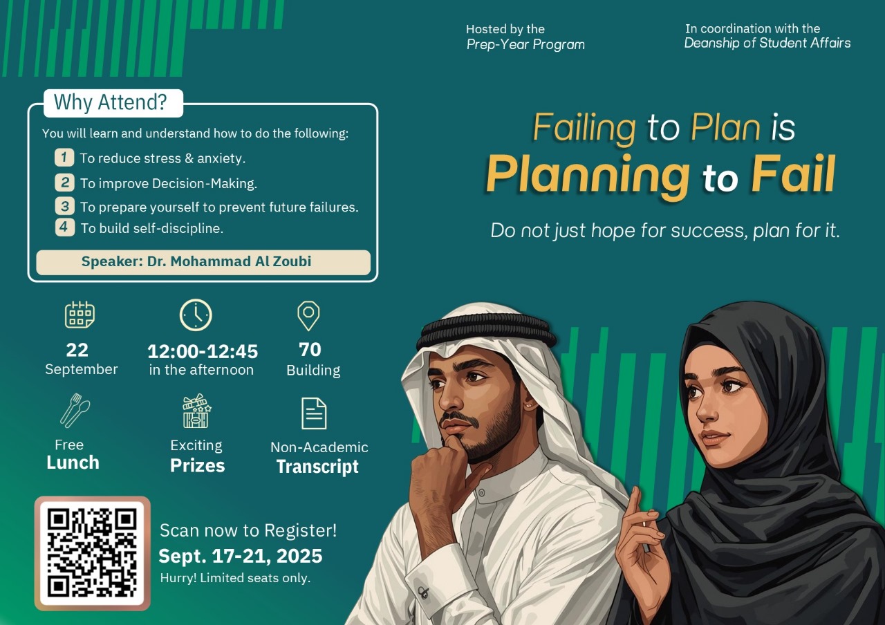 “Failing to plan is planning to fail.” With this in mind, Dr. Mohammed Al Zoubi delivered an inspiring lecture on September 22, 2025. Organized by the Prep Year Program in collaboration with the Deanship of Student Affairs, the session focused on practical strategies to reduce stress and anxiety, improve decision-making, prepare for future challenges, and build self-discipline. The goal was to encourage students to actively shape their own success instead of leaving it to chance.